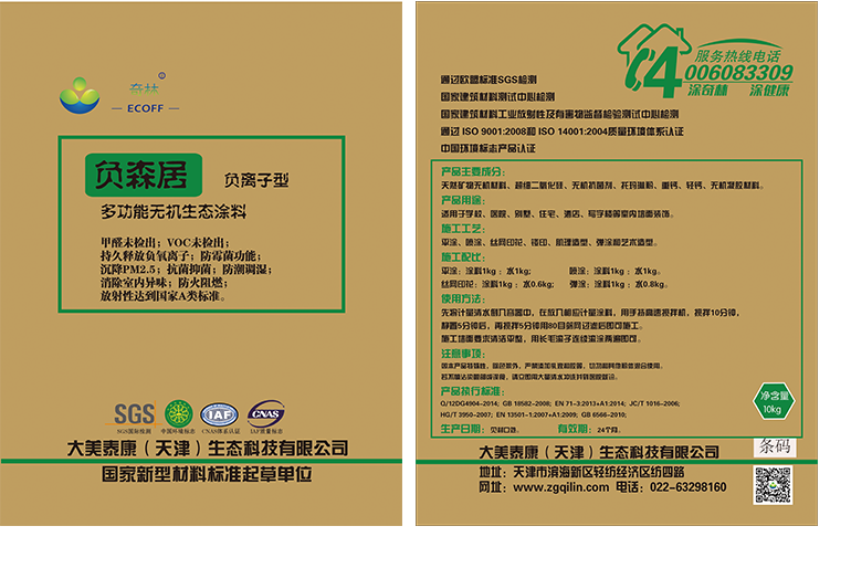 負森居-負離子型:無機多功能生態(tài)涂料1.甲醛未檢出;VOC未檢出;2.抗菌抑菌;防霉菌功能;3.防潮調(diào)濕;消除室內(nèi)異味;4.防火阻燃;5.放射性達到國家A類標(biāo)準(zhǔn);6.持久釋放負氧離子;沉降PM2.5。凈含量:10kg